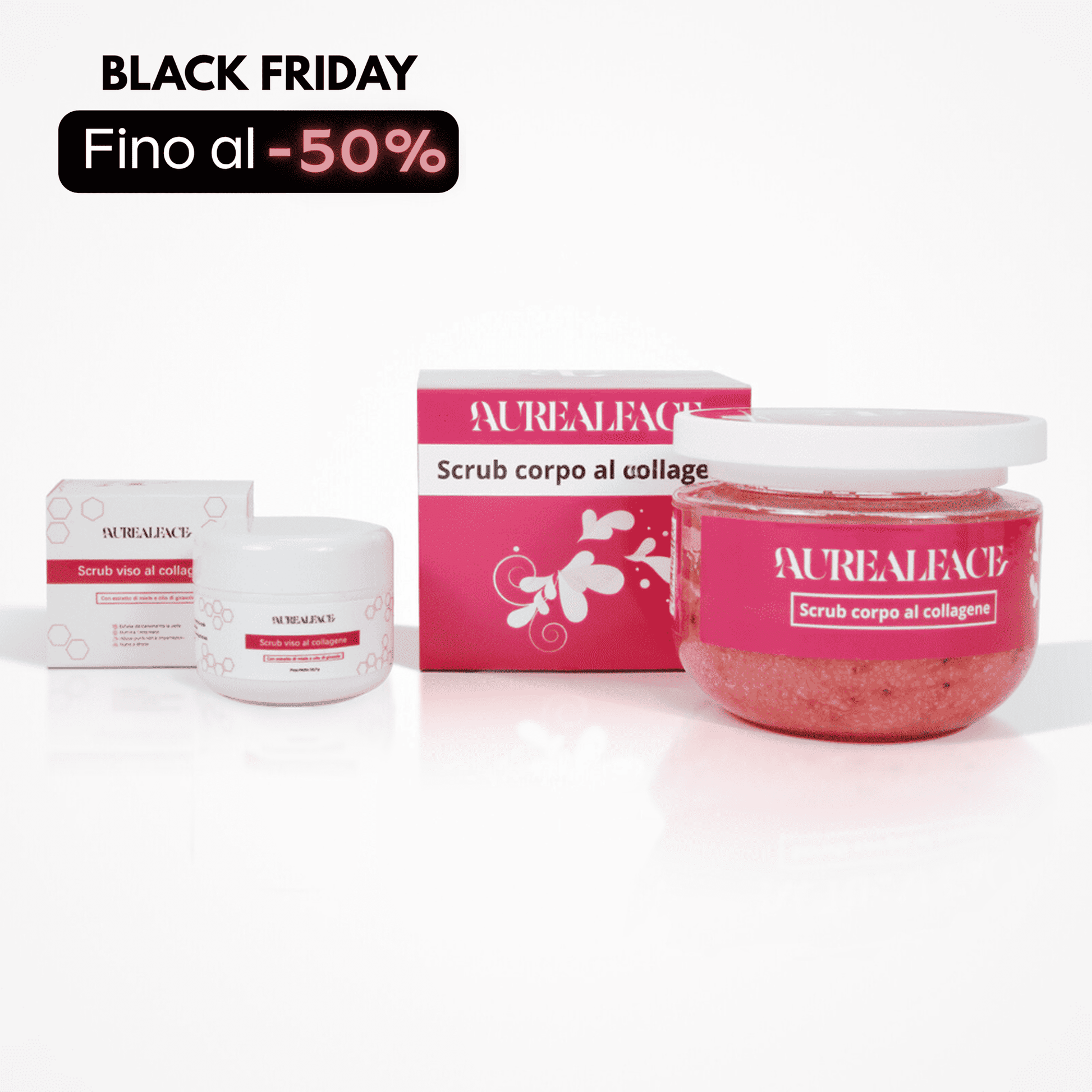 Rinnova la tua pelle a 360° con il bundle esfoliante Aurealface: lo Scrub Viso al Collagene rimuove le impurità con delicatezza lasciando il volto più liscio e luminoso, mentre lo Scrub Corpo agisce in profondità per levigare e nutrire anche le zone più secche del tuo corpo.
